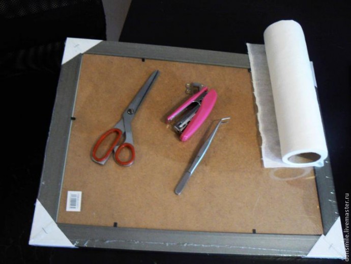 Разбираем раму (нам понадобится картонка). Ткань прикрепляем к картонке с помощью степлера или скрепок. Это необходимо для того, чтобы в процессе работы шерсть не съезжала с основы (материал должен быть шероховатый).