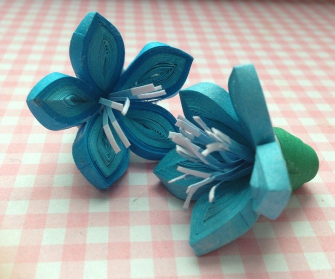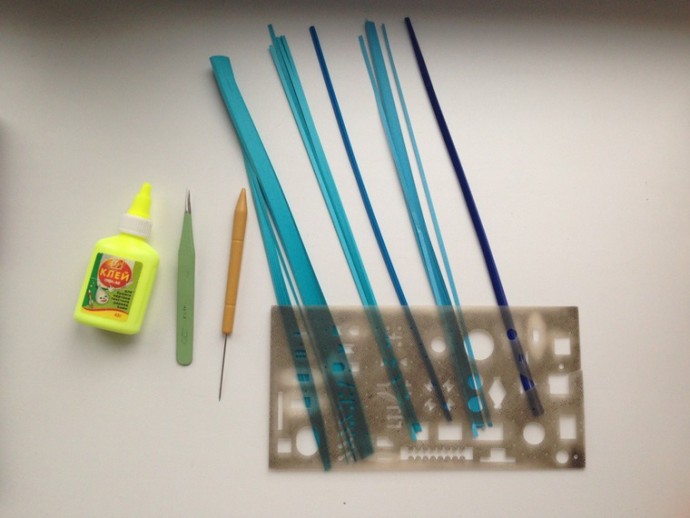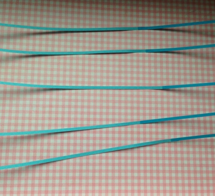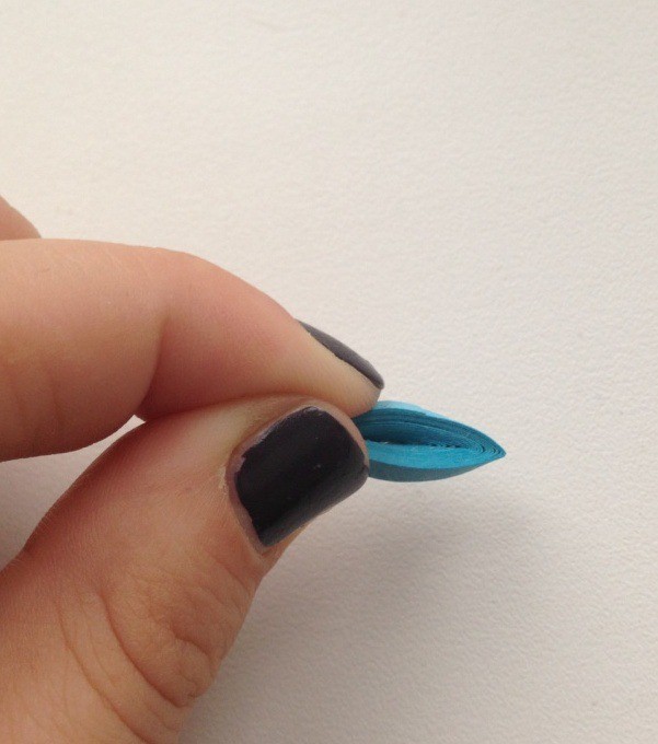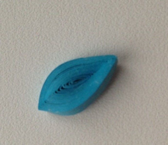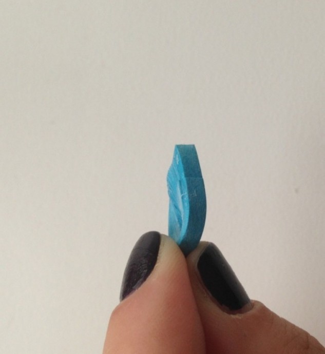 Для одного лепестка берем 2 полоски голубого цвета (можно разных оттенков). Склеиваем между собой, скручиваем в тугой рол.
