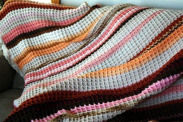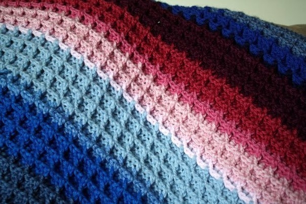Плед вяжется столбиками с одним накидом. Эффект ячеек получается если провязывать один столбик в петлю нижнего ряда как обычно, а следующие два заводя крючок за сткнку столбика нижнего ряда. Так два столбика провязать. Тут нужно поиграть. Провязать небольшой кусочек, чередовать два или три столбика. Как вам больше понравится. Один минус у этой вязки, расход нити значительно увеличивается. Удачи всем!