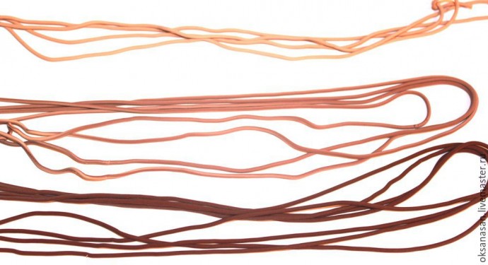 Разомните несколько кусочков глины разных оттенков, сформируйте небольшие цилиндры по диаметру экструдера, сложите вместе от темного к светлому, вложите в экструдер и выдавите. Для изготовления такого браслета одной закладки не хватит, поэтому я разделила всю глину на две порции: от темного к среднему цвету по насыщенности, а затем от среднего до белого.