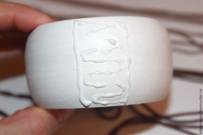 Грунтовать браслет акрилом, клеем ПВА или полимерным гелем нужно для лучшего сцепления глины с поверхностью. Перед запеканием желательно сделать иголкой проколы на глине, но в данном случае это нужно делать только на внутренней стороне браслета.
