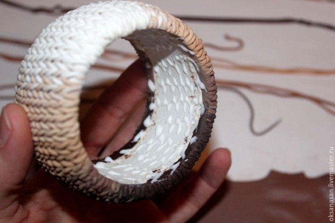 Когда браслет остынет, лезвием подровняйте края косичек с внутренней стороны, срежьте лишнюю глину.