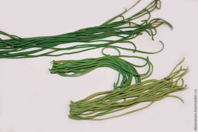 Смешайте зеленую и светло-зеленую глину, чтобы создать еще один средний цвет. Глину трех цветов выдавите чрез экструдер. Из этих «веревочек» будут стебли и листья.