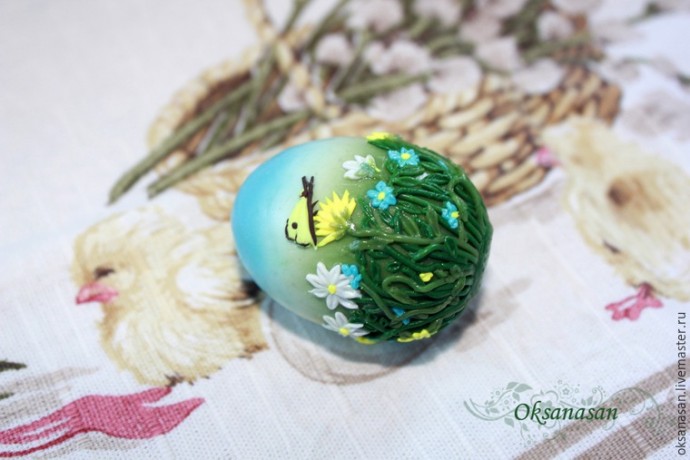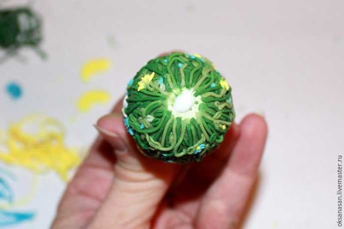 Когда работа будет закончена, на нижнее донышко яйца нанесите гель и заклейте его кусочком зеленой глины, не забудьте сделать проколы зубочисткой.