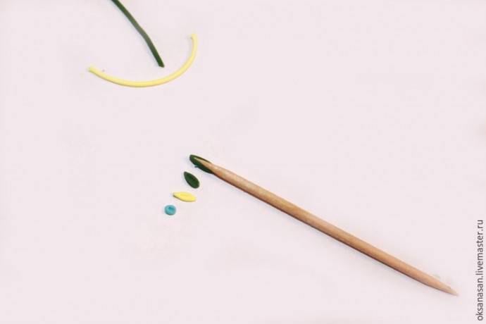 Отщипывайте зубочисткой небольшой отрезок глины от «веревочки», скатайте его между пальцами либо в шарик, либо из шарика в продолговатую фигуру (см. фото). Кончиком зубочистки сделайте углубление и с ее же помощью прилепите в нужное место.