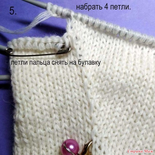 Снимаем петли пальца с булавки на спицу. Нитку присоединяем после снятых петель. Оставляйте хвостик подлиннее. Далее я набираю (крючком-помощником) одну петельку из боковых протяжек. Затем по одной петле из долек перемычки ладони. Их, как правило, 4 петли. И снова одну петельку из боковой перемычки.