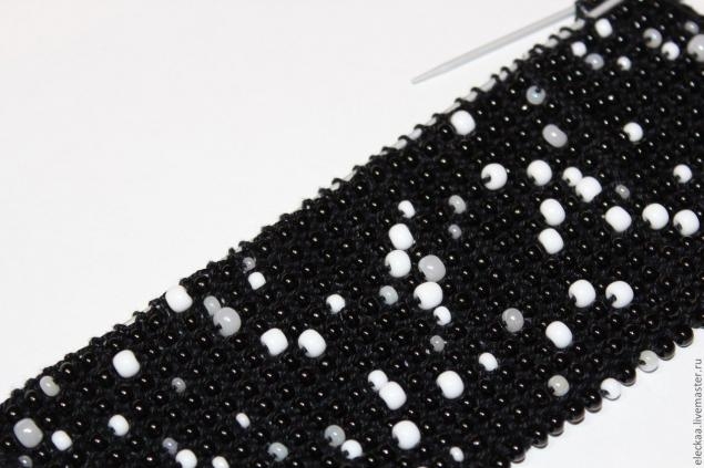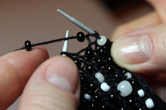7. Полотно вяжем лицевой гладью, с бисером провязываем изнаночный ряд. Техника очень простая, провязываем изнаночную петлю, сдвигаем бисеринку, провязываем следующую петлю, бисеринка у нас закрепляется между петель. Лицевой ряд вяжется без бисера.