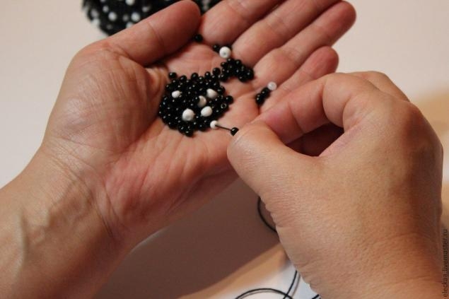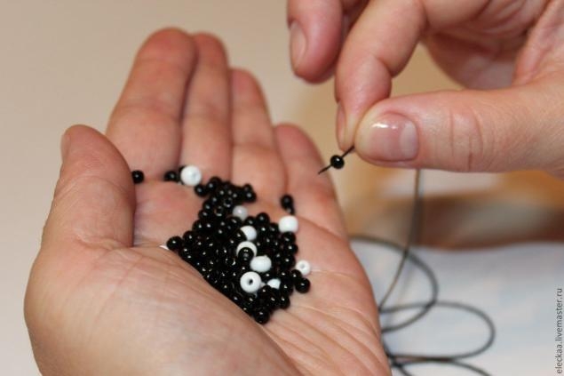 5. Когда кончики ниток хорошенько затвердели, подрезаем ножницами так чтобы кончики были острыми. И нанизываем бисер на нитку.