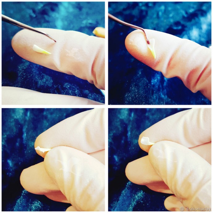 Тонкие лепесточки укладываем на пальчик и стеком или какой-нибудь тоненькой лопаточкой, примерно от середины к краю влево и к краю вправо, расширяем лепесток, при этом его утончая, главное не перестараться, иначе глину можно просто порвать. Полученный утонченный край аккуратно изгибаем стеком или зубочисткой в разных направлениях.