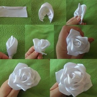 Прежде всего, необходимо подготовить инструменты и материалы. Для работы потребуется атласная лента, свеча, иголка с ниткой и клей. Ни в коем случае нельзя отступать от предлагаемого хода работы – в противном случае велика вероятность допустить непоправимые ошибки. Для одного бутона розы потребуется 7 см ленты. В общем количестве таких полос потребуется 12 штук. Отрезанные полоски опаливаются с двух сторон.Уголок ленты необходимо загнуть наизнанку. Полученный острый угол накладывается на лицевую часть несколько раз, после чего фиксируется ниткой.По аналогичной схеме загибается второй угол ленты. Нить требуется слегка стянуть. Так же обрабатываются все 12 полос.Из одной основы под лепестки делается серединка. Она заворачивается в трубочку и фиксируется при помощи нити и иголки.Вокруг середины цветка заворачиваются оставшиеся заготовки лепестков. Причём первые лепестки можно сшивать, а последующие предпочтительно склеивать. Не стоит забывать, что каждый новый накладываемый лепесток идёт внахлёст.Для пышности бутона можно применить несколько лепестков большего размера.