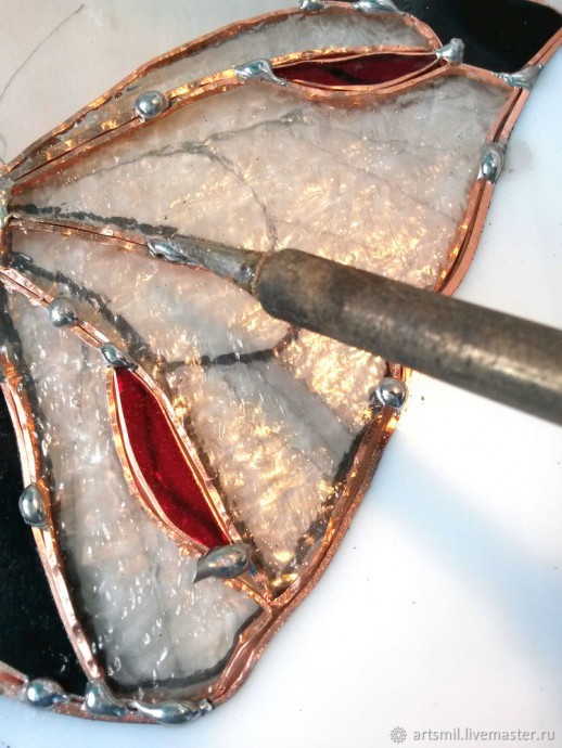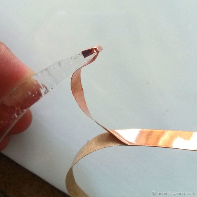 После того, как все детали идеально подходят друг к другу, оборачиваю их медной лентой. Медная лента приклеивается к торцу стекла, как скотч. Важно, чтобы лента загибалась равномерно со всех сторон и плотно прилегала.