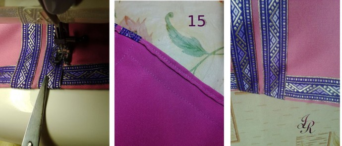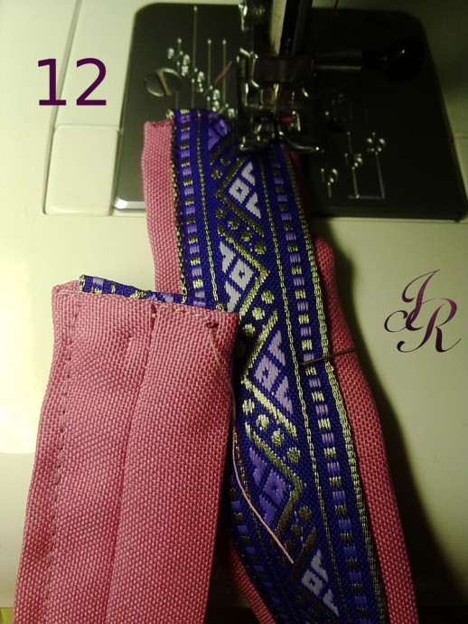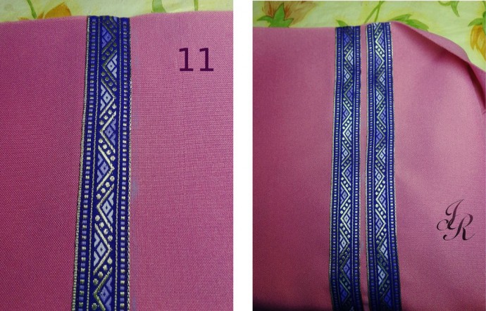 Сначала оформляем низ. Тесьму пришиваем под центральные полосы (прячем под них концы). Для этого просто надпарываем часть шва центральной тесьмы и подсовываем под неё кончик нижней тесьмы. Прострачиваем надпоротое и пристрачиваем отделку. При этом нижний край тесьмы настрачиваем по уже имеющейся строчке.