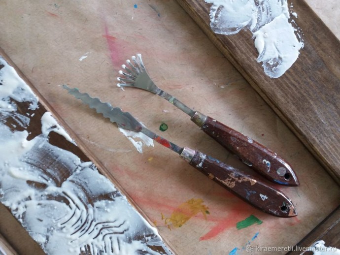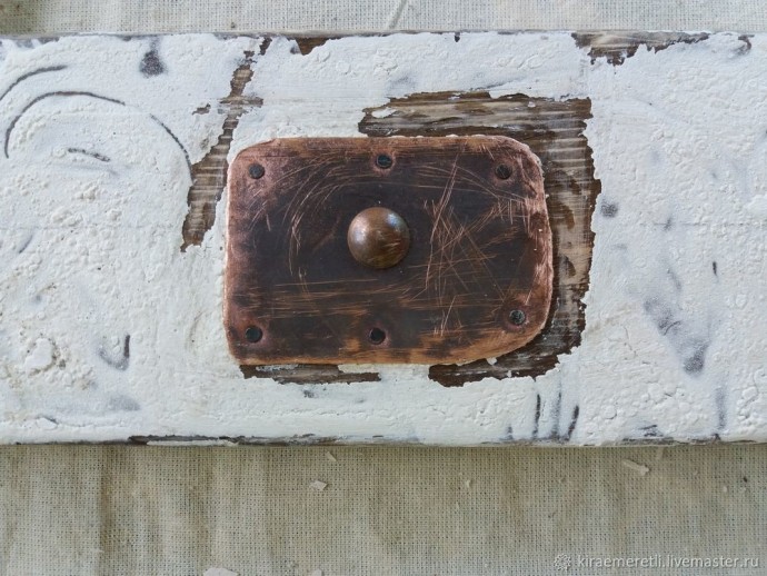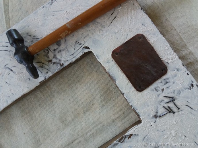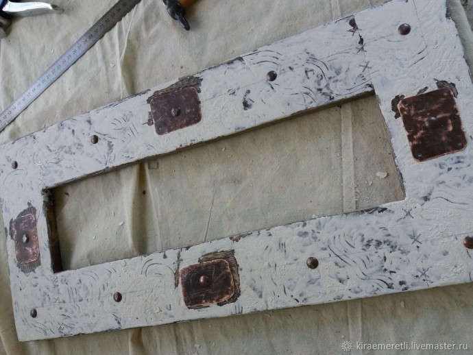 Следующий этап — украшаем нашу рамку декоративными элементами. Я для этого использую медные пластинки. Медь, дерево, воск, камень — всё это натуральные материалы, которыми мы украшаем нашу картинку, делая её ещё ценнее. Эти мелочи создают ощущение глубины времени,в котором существует сюжет, прикосновения к эти материалам обогащает фантазию будущего владельца нашей картинки.