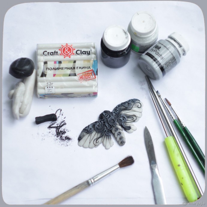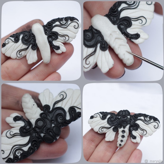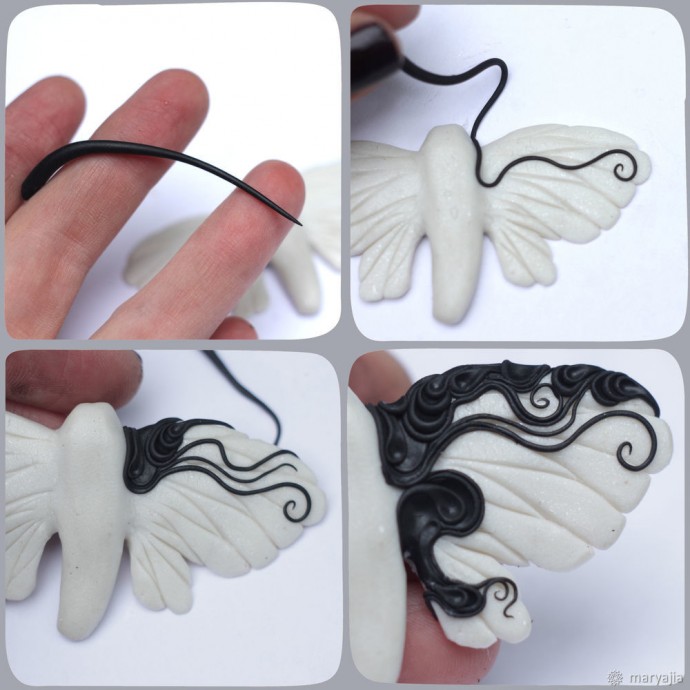 Далее раскатываем жгуты темной пластики,и наносим на крылья узор. В некоторых местах жгутами, в других — расплюснутыми шариками. Здесь можно дать волю фантазии