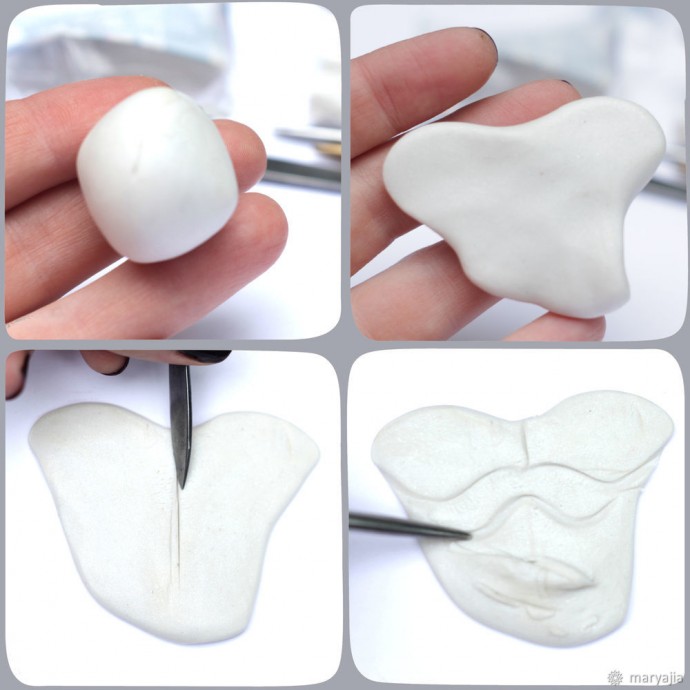 Берем основной цвет нашей бабочки — у меня она белая, бледный мотылек. Разминаем пластику в руках, от тепла рук она становится мягкой, податливой, далее скатываем в шар. Начинаем плющить его и придавать шару форму бабочки.