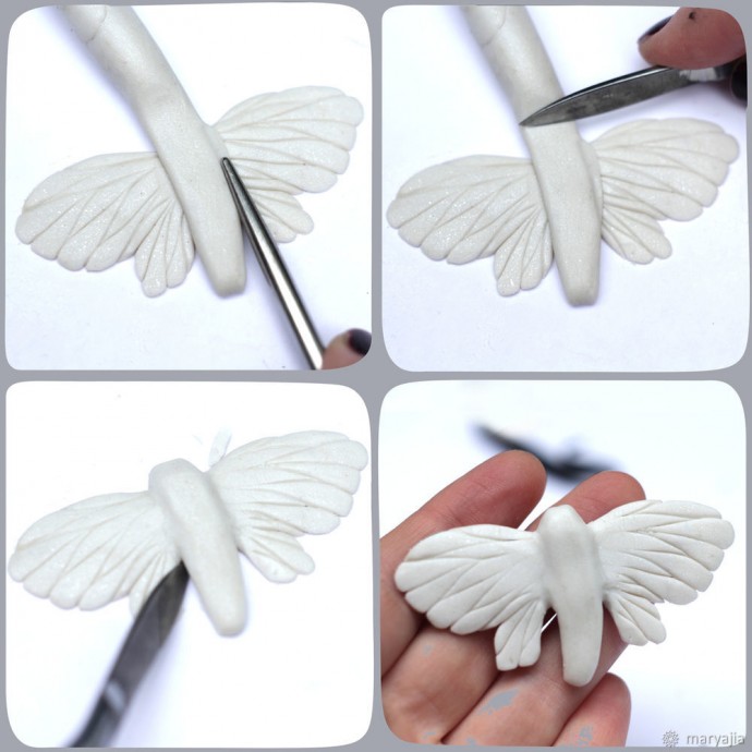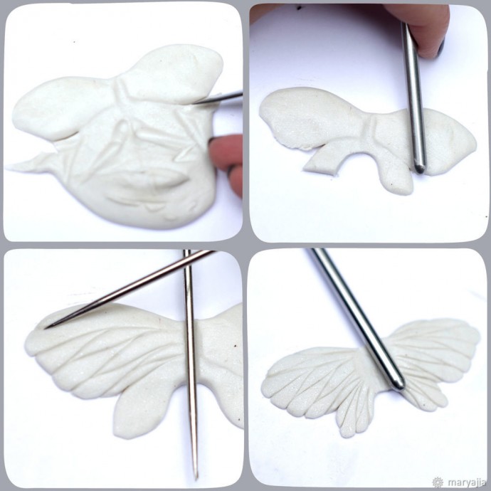 Далее иглой или шилом создаем на крыльях узор, продавливая и протягивая линии от края крыла к центру, сводя их вместе.