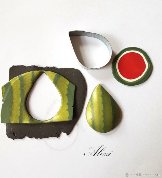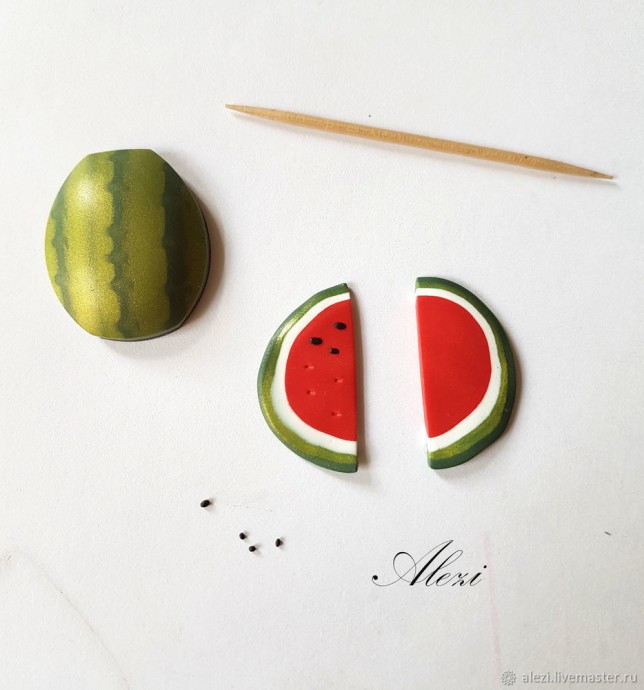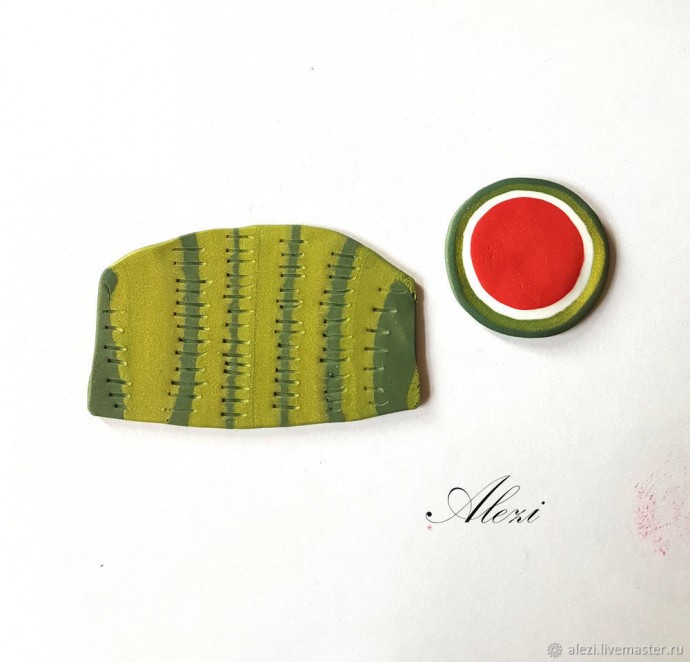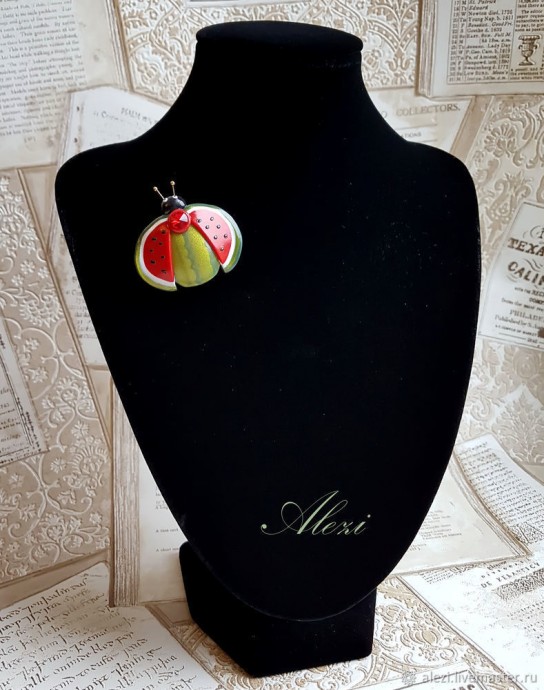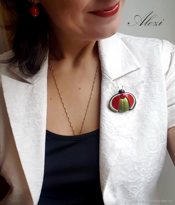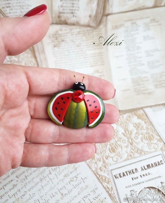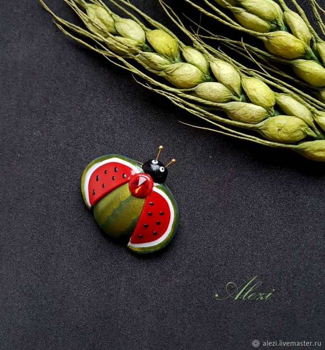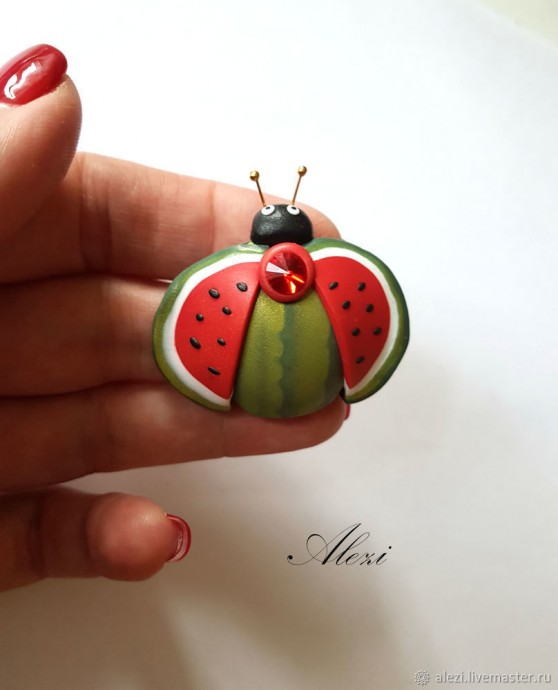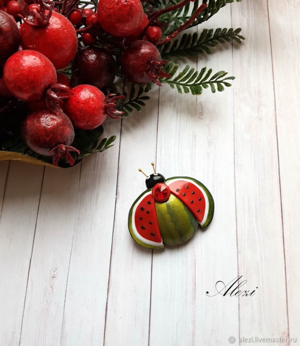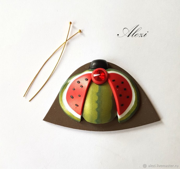 Я поймала себе на мысли, что ломтик арбуза напоминает мне панцирь божьей коровки. Броши в виде обычных божьих коровок я уже лепила. А вот в арбузном виде ни разу