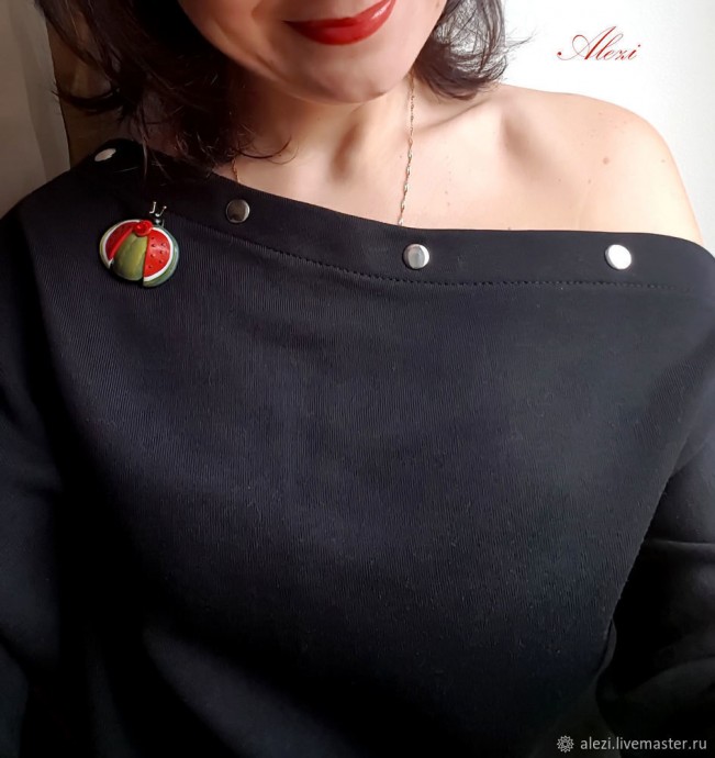 Что же в итоге получилось? Получилась милая, очаровательная брошь, которая своим необычным дизайном привлекает внимание и поднимает настроение. Ведь без улыбки на неё не взглянешь :) Как я говорю, это — божья коровка, которая объелась арбуза