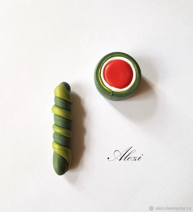 Для начала я сделала небольшой цилиндр из красной полимерки и приготовила три слоя полимерки белого, светло-зеленого и темно-зеленого цвета.