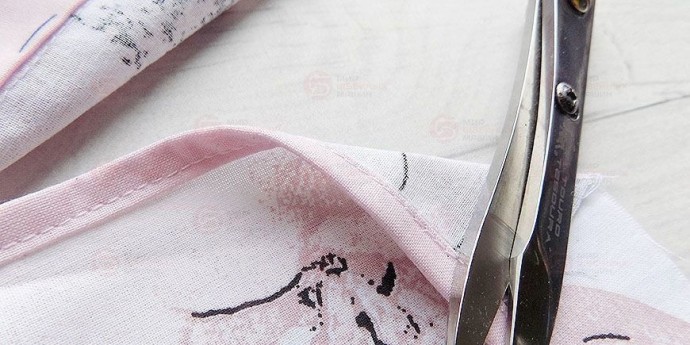 Разрежьте по намеченной линии, не доходя до верха на 1 см, от этого места разрежьте ткань по диагонали вправо и влево почти до строчек. Разрез не должен захватывать ткань обтачки и планки!