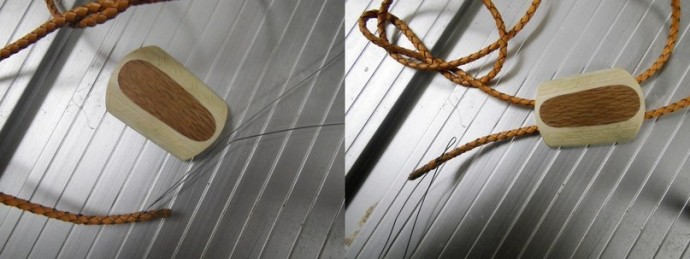 Делаем не хитрое приспособление из тонкой проволоки продев её сквозь шнур, оно нам понадобится чтоб втащить шнур в тоннели. Кончик шнура надо проклеить перед протяжкой, что бы он не распустился внутри, иначе толку не будет от нашей приспособы проволочки. После протяжки шнура примеряем галстук, что бы определить какой длинны шнур оставить, хотя как показала практика, шнур можно и заранее нарезать по 70-80 см., но не суть, примерили, обрезали, обрезанный край проклеили, чтб не распускался, я это делал суперклеем. Всё готово, остается вклеить концы шнура в наши подготовленные ранее кончики рога. Последним делом, заполняем гравировку, хотя, это можно сделать и до сборки.