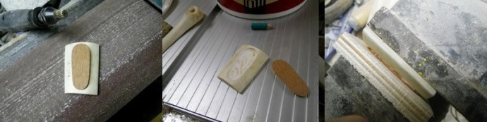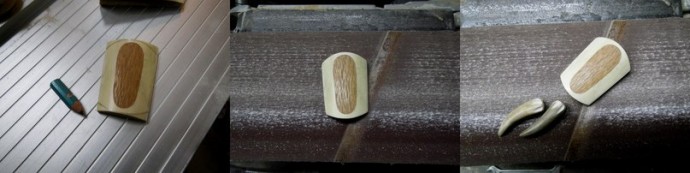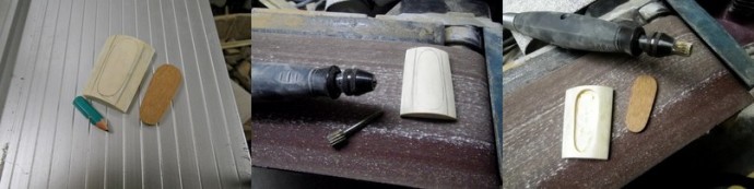 Вставил лейсвуд в углубление (на сколько он вставился конечно) и надавил на него пальцами по всей площади. Вынул лейсвуд назад и осмотрел, где появились вмятины от рога — краев углубления. Ах да, надо отметить, что инкрустация из лейсвуд, если смотреть в сечении, имеет трапециевидный профиль, то есть лицевая поверхность по площади больше, чем вставляющаяся в углубление, но тут главное не переусердствовать.