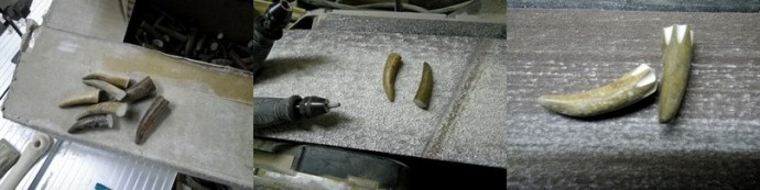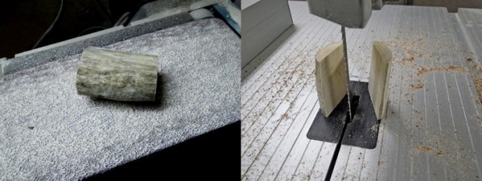 А далее взялся за рог. Сточил лицевую сторону. Пока точил подумал, что толстовато для галстука, жаль так много снимать для нужной (эстетичной) толщины и решил его тоже вдоль распустить. Опять же... распущенный надвое рог, это уже не один галстук, а два О_о