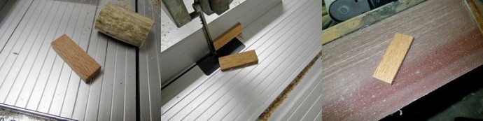 Вторым этапом выберем и подготовим материал для нашей инкрустации. Ну, я решил, что галстук будет с инкрустацией. Вот, на глаза мне попался кусочек лейсвуда, его и взял. Но так как он был толстоват, то распустил его на ленте. После чего отшлифовал 150 наждачкой. Этого пока достаточно.