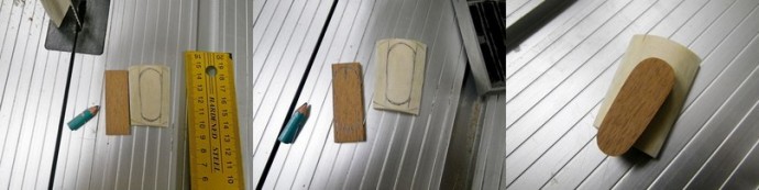 После того как обточил грубую форму рога (нажд 40), сделал на нем грубый набросок формы и будущей инкрустации, промерял примерный размеры наброска инкрустации и нарисовал на лейсвуде линии по которым выточим уже саму инкрустацию. Так как циркуль не нашел, то рисовал от руки полукруги, вышло хорошо! После рисования выточил форму инкрустации (нажд 150) и прошелся по рогу тоже мелкой наждачкой (нажд 150), чтоб убрать каракули свои