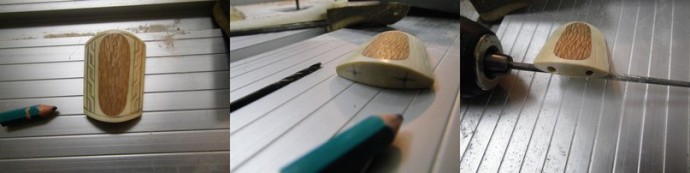 Далее.. Разметил на роге, по направлению волокон, пределы в которых должна лежать инкрустация, приложил выточенную из лейсвуд инкрустацию и обрисовал карандашом. Взял любимую фрезу, бор машинку и выбрал углубление в роге, глубиной примерно 3-4 мм в самых верхних точках (лицевая часть галстука в сечении радиальна) и 2 мм в нижних.