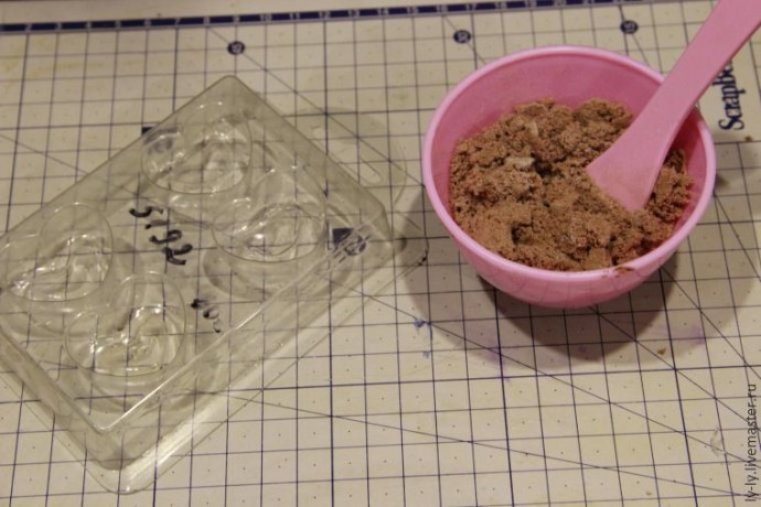 Далее положим смесь в формочки и хорошенько утрамбуем.