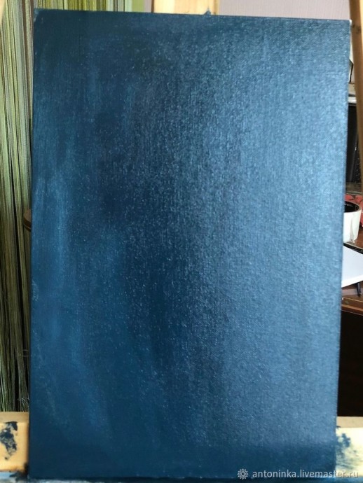 1. Делаем замес из двух красок — голубая ФЦ и индиго. Разбавляем растворителем до консистенции сметаны и заполняем полностью холст получившимся цветом. Используем кисть щетина флейц.