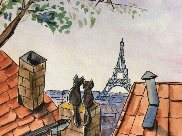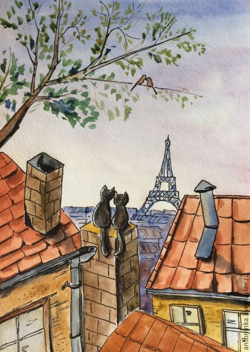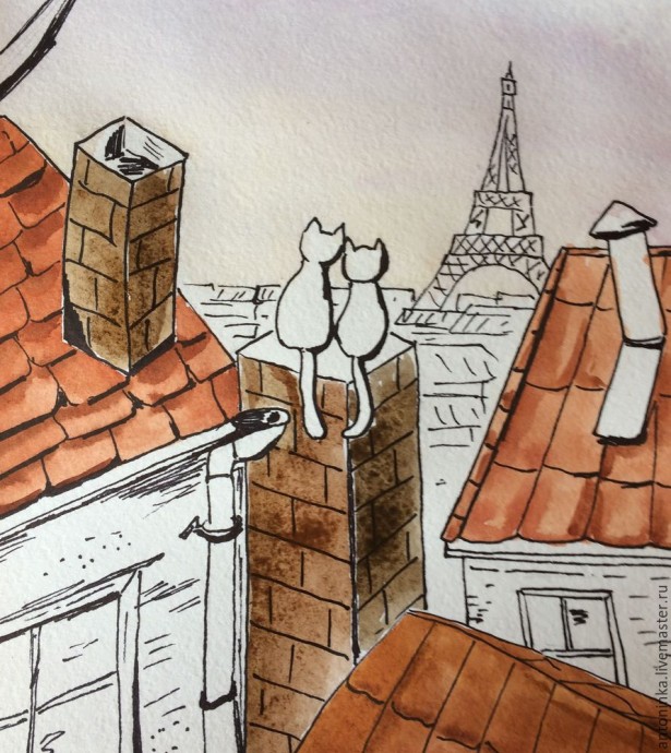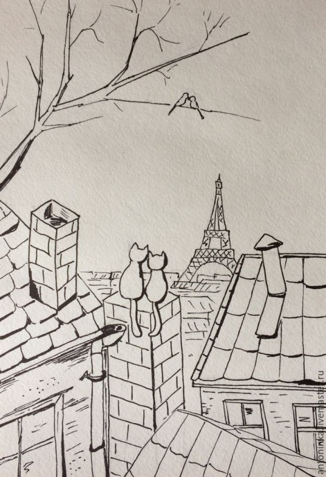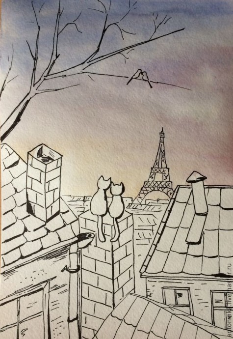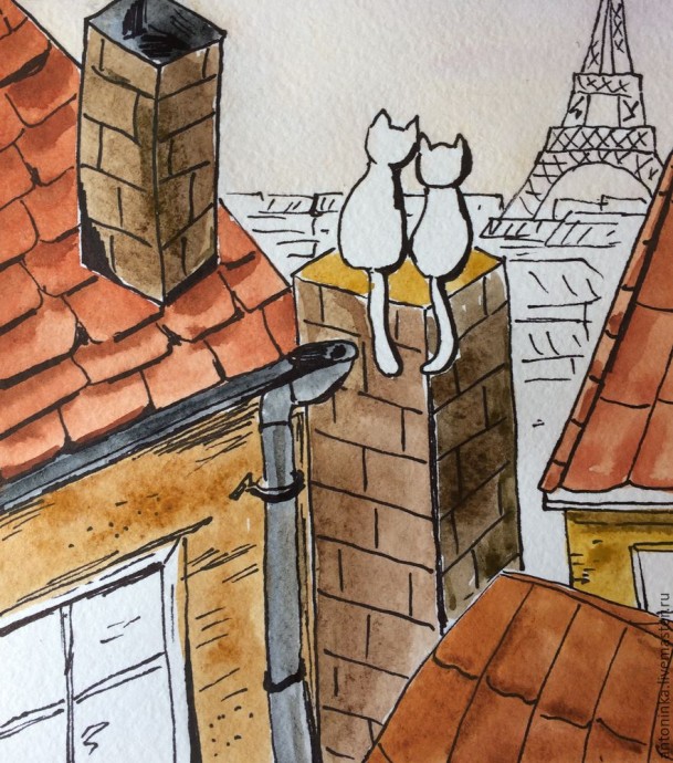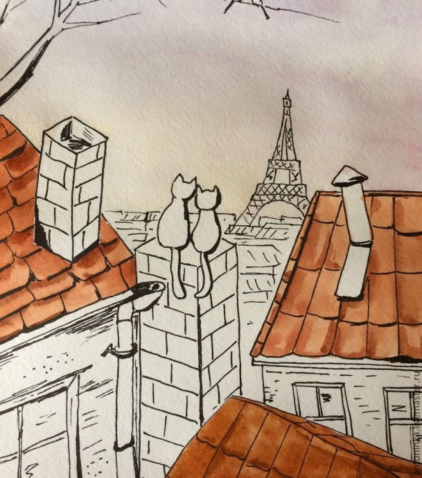 8. Дома вдали и сама Эйфелева башня — синеватые холодные цвета. Котики у меня черные — самые счастливые:) Слева оставила небольшую полоску по контуру котов, а справа немного затемнила. Осталось сделать полупрозрачные тени от труб, крыш и котов — и наш рисунок готов