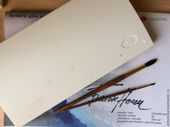 3. Теперь начинаем заливать небо. Для неба нам понадобится 3 цвета. Начинаем закрашивать сверху голубым, добавляя к середине розовый и ближе к линии горизонта — желтый. Работать надо быстро, чтобы краска не высохла и за один присест выполнить заливку всего небушка. Акварель при высыхании светлеет и мы получаем такое нежное небо, рассвет.