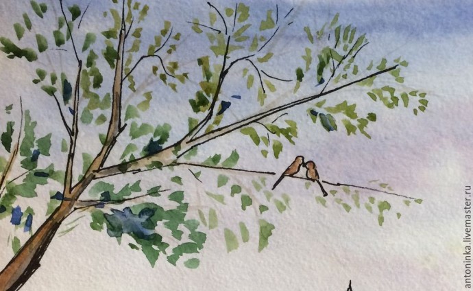 7. Теперь можно перейти к веточке. Красим ее коричневым, а когда она подсохнет делаем листву — от холодно-зелено-голубоватых в тени до желто-зеленых на свету. Птички на веточке у меня серо-коричневые.