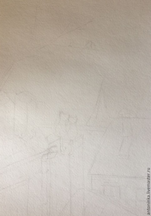 4. Затем преходим к крышам. Закрашиваем их оранжево-коричневым цветом. Здесь краску берем немного погуще — на переднем плане предметы самые яркие и четкие. Но в то же время краска не должна быть очень густой, как гуашь. В полупрозрачности вся прелесть акварели. По контурам кое-где затемняем черепицу коричневым, делая ее более объемной.