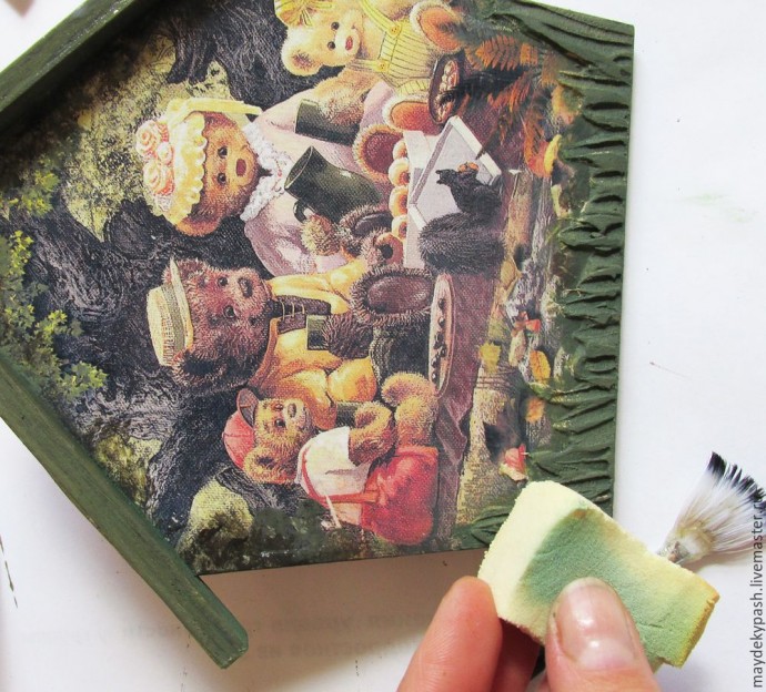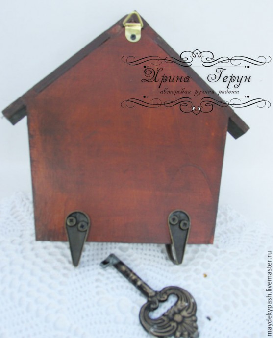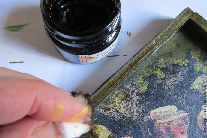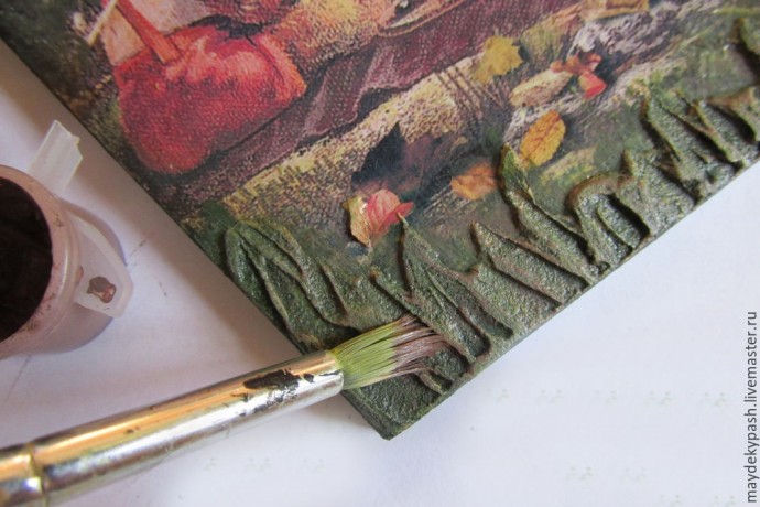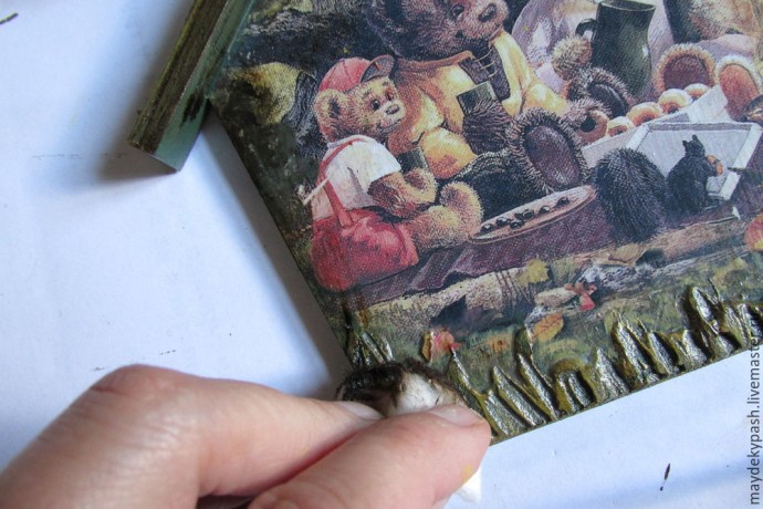 20. Немного состарим работу с помощью битумного воска, пройдемся губочкой по рельефу, по краям ключницы.