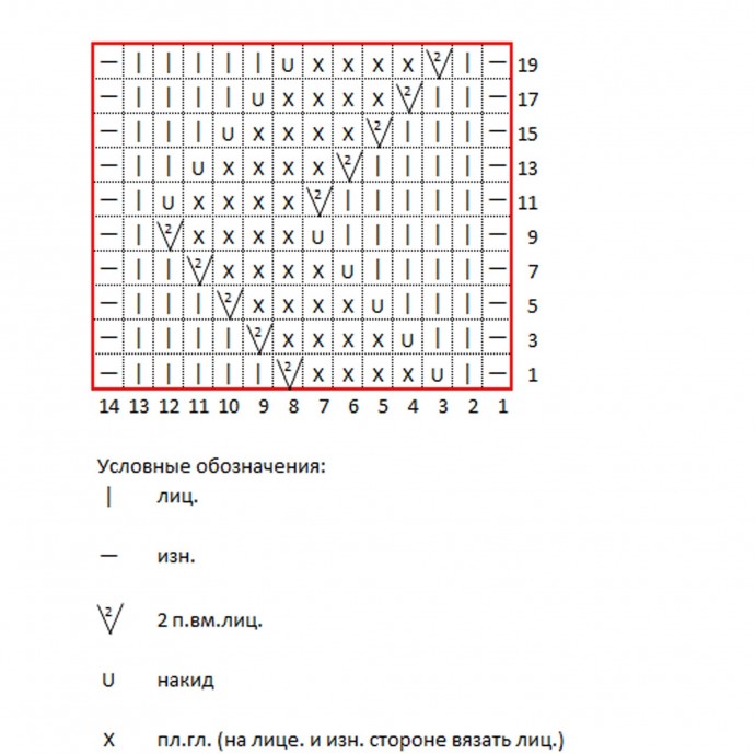 19-й ряд: 1 изн., 1 лиц., 2 п.вм.лиц., 4 п.пл.гл., накид, 5 лиц., 1 изн.