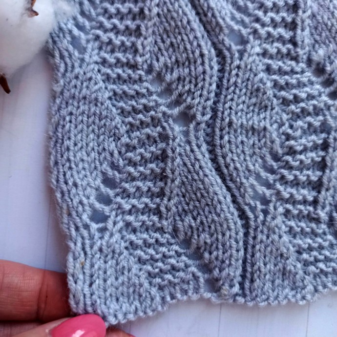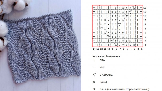 Раппорт узора составляет 14 петель + 2 кромочные и 20 рядов