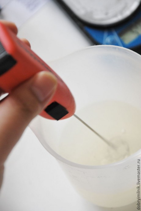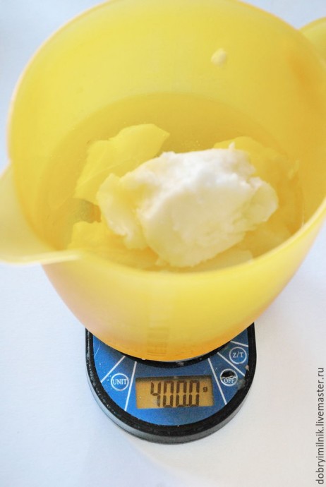 Шаг 1 В чистый сухой кувшин добавляем все подготовленные жирные масла. 10 гр миндального масла вычитаем из общей массы и наливаем в маленький стаканчик — я брала стопку. Там будем разводить диоксид титана, чтобы в мыле не было белых крапинок.