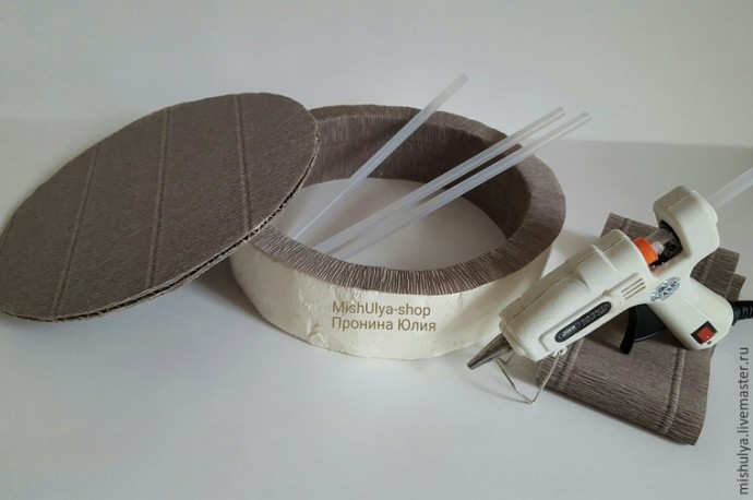 Обклеиваем картонное основание и пеноплексовую форму гофрированной бумагой, выбранного вами цвета. Картон я обклеивала с помощью двустороннего скотча, а по кругу немного горячим клеем. А пеноплекс только термоклеем.