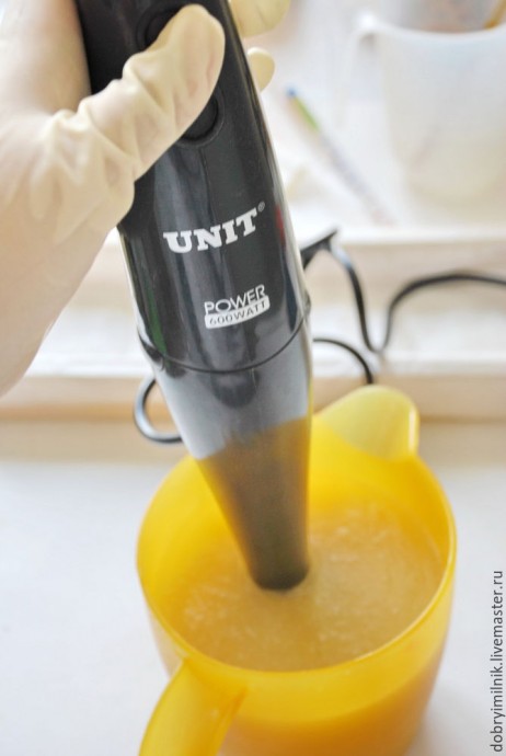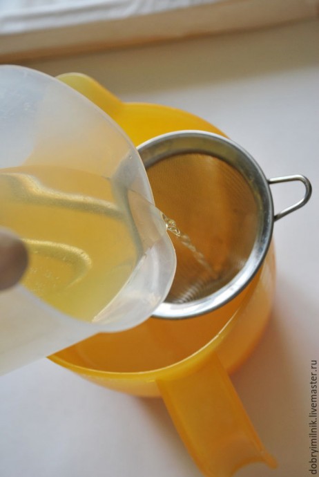Когда масла и щелочной раствор достигнут одинаковой температуры, примерно 30 градусов, добавляем отдушку, тщательно перемешиваем и вливаем через ситечко щелочной раствор в масла.
