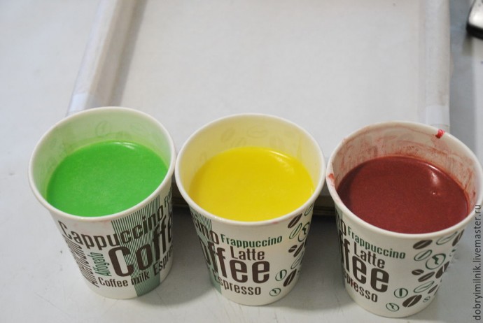 Окрашиваем массу в стаканчиках, добавляйте краситель до нужной вам интенсивности цвета, но учтите, что переизбыток красителя потом может сказаться на цвете пены и воды.