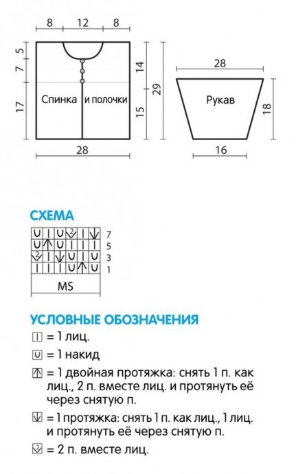 Лицевая гладь: лицевые ряды – лицевые петли, изнаночные ряды – изнаночные петли. Ажурный узор: вязать по схеме, на которой приведены только лиц. р., в изн. р. все петли вязать по рисунку. Повторять с 1-го по 8-й р.