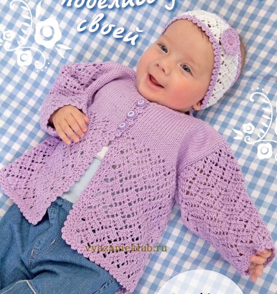 Вам потребуется: для жакета 200 г сиреневой, для повязки 50 г белой и немного сиреневой пряжи Schulana Cotinella (100% хлопка, 135 м/50 г), спицы № 3,5, крючок № 3, 3 пуговицы.