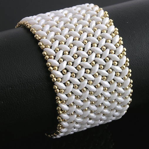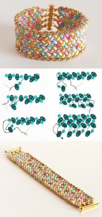 Браслет из бисера и бусинДля плетения вам понадобится бисер или мелкие бусины и гораздо более крупные продолговатые бусины.Ряды одинаковые, но чередуются в зеркальном отражении.
