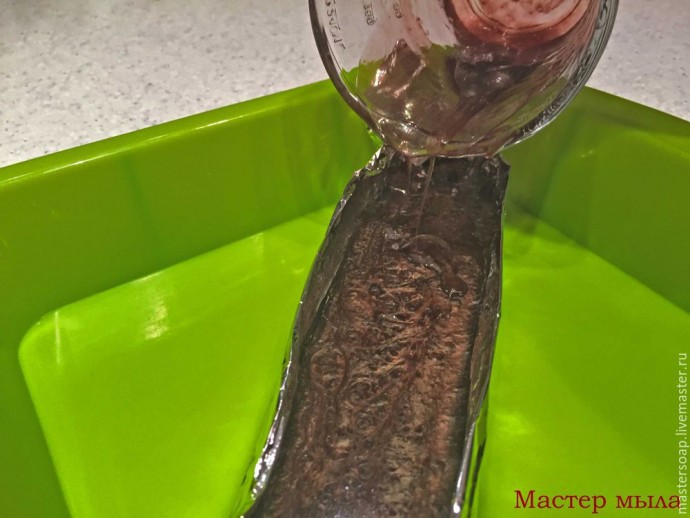Плавим необходимое количество прозрачной основы, подкрашиваем ее коричневым перламутром, он придаст неоднородность текстуре. Заливаем в подготовленную нами форму и ждем ее застывания.