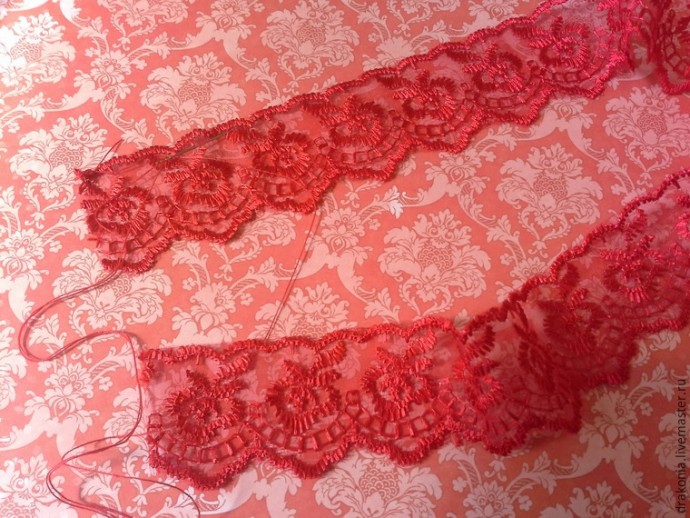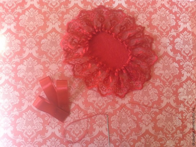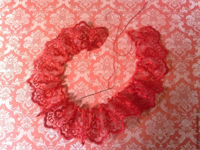 Итак, приступим. Для начала собираем кружево по внутренней стороне на нить с шагом примерно 1 см, на расстоянии около 2-3 мм от края.