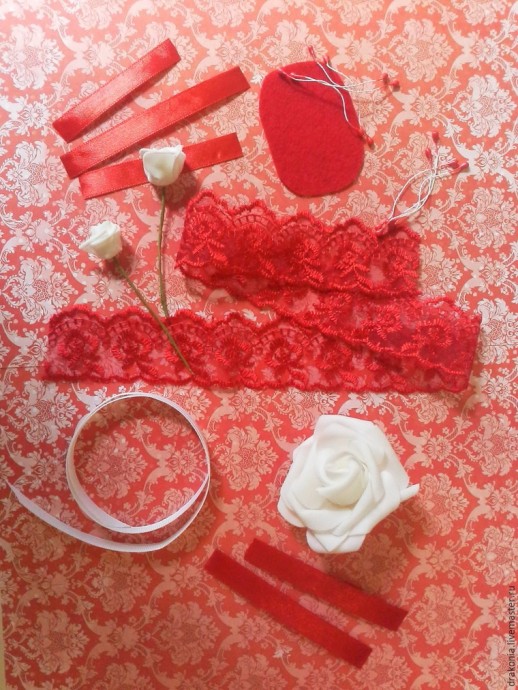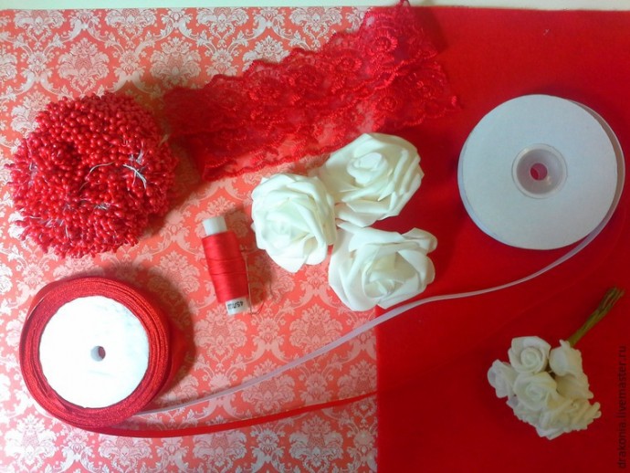 - красная атласная лента, шириной 1 см, длиной около 50 см;