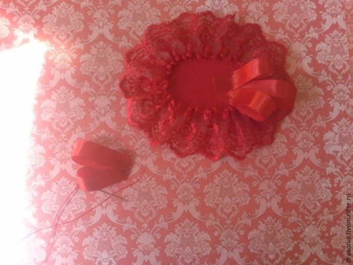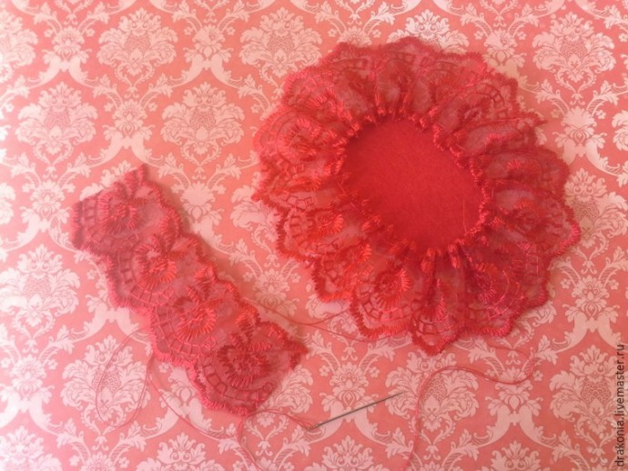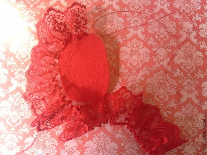 Далее, начинаем пришивать рюшку к фетровой основе, на расстоянии около 3 мм от края фетра. Прихватываем нитью рюшку, расправляя ее или присбаривая, если это требуется. Как показала практика, для данного браслета лучше начинать пришивать кружевную рюшку с круглой короткой стороны овала. Место, где кружево заканчивается и начинается, потом прикрывается декором и становится незаметным